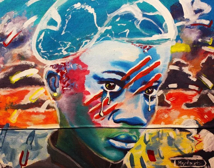 The composition is defined by three aggressive red finger marks, war paint dragged across the subject’s face, symbolizing a violent interruption of autonomy. While the paint marks the subject for conflict, the tears represent a spiritual radiance that persists despite forced desensitization. This work established the conceptual foundation for the "dry cry" a physiological boundary where the capacity for outward mourning is exhausted by the necessity of survival.